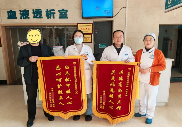 近日,长期在我院接受透析治疗的尿毒症患者闫女士,在踏上返乡与家人团聚的旅程前,特意将两面承载着满满感激之情的锦旗送到了肾病与风湿免疫科医护人员手中,用最质朴的方式表达对全体医护人员的诚挚谢意。