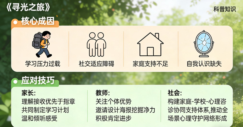 近日,聚焦青少年心理健康的心理教育科普片《寻光之旅》上线,以科普视角拆解“不想上学”背后的心理成因,用“真实镜头+科学解读”的方式,为家长、教师及社会提供专业的心理教育参考。